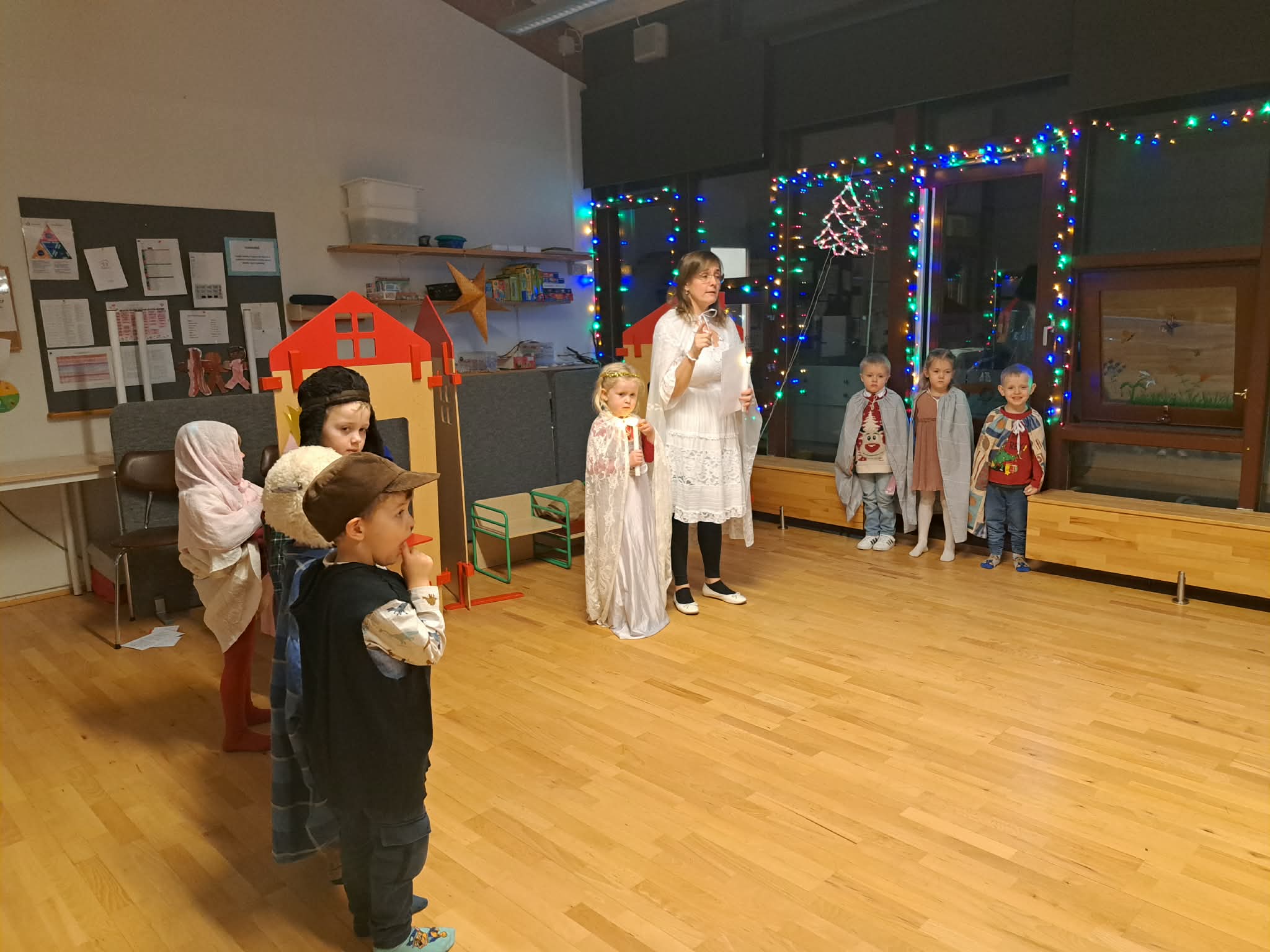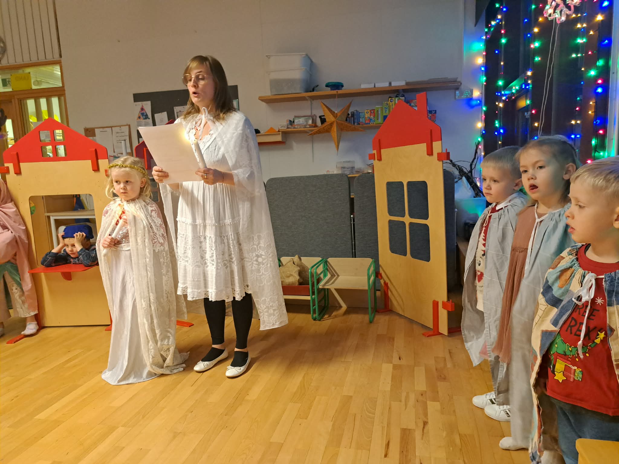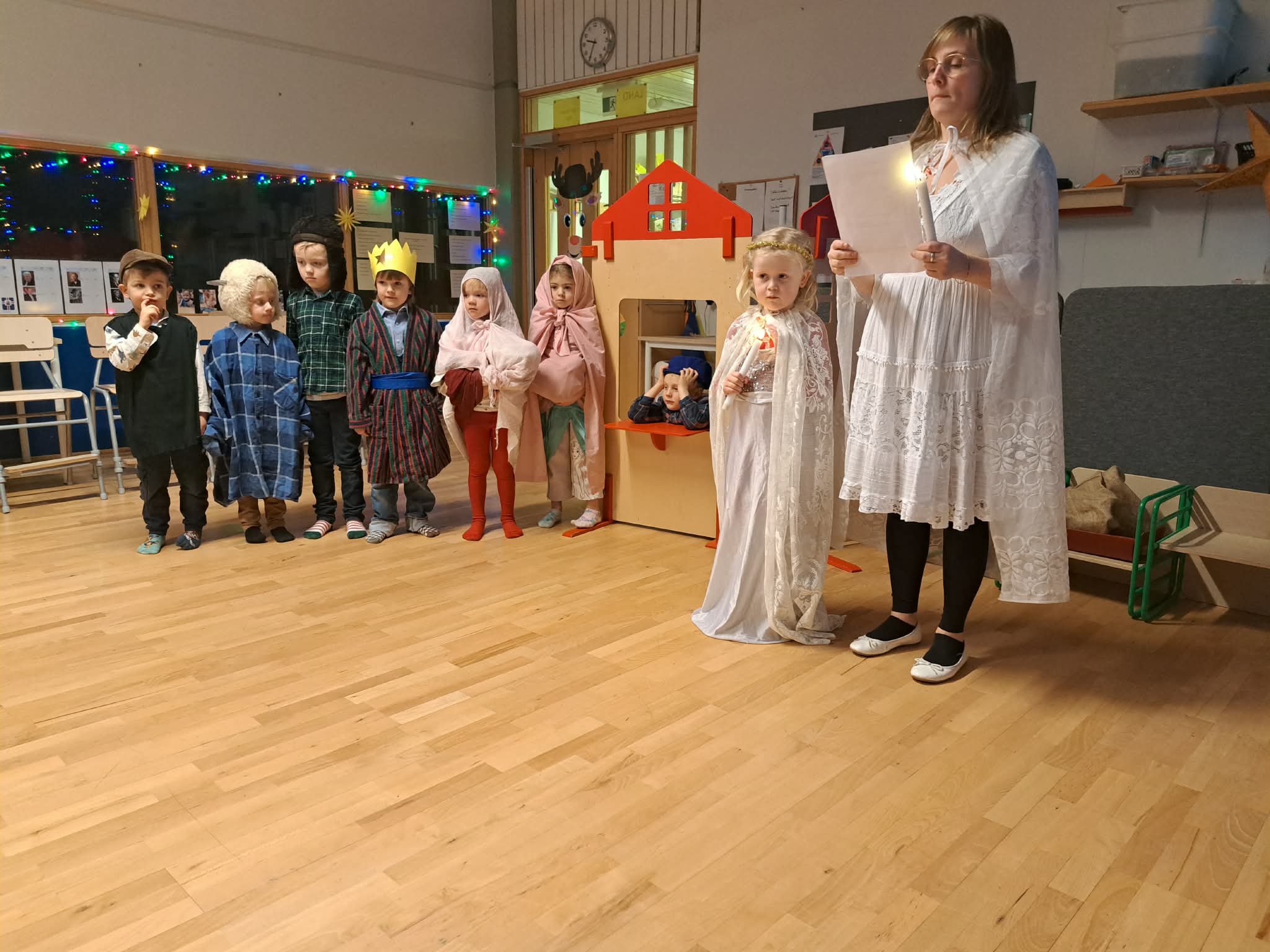 Síðastliðinn föstudag héldum við okkar árlega jólaball hér í leikskólanum. Hátíðin hófst á því að elstu börnin í rauða hóp fluttu helgileik, með stuðningi nokkurra sjálfboðaliða úr gula hóp. Helgileikurinn er fastur liður í undirbúningi jólanna og börnin hafa töluverð áhrif á framsetningu leikritsins, þó grunnurinn sé ávallt sá sami. Í ár voru til að mynda tvær Maríur og á síðasta ári var enginn Jósep.