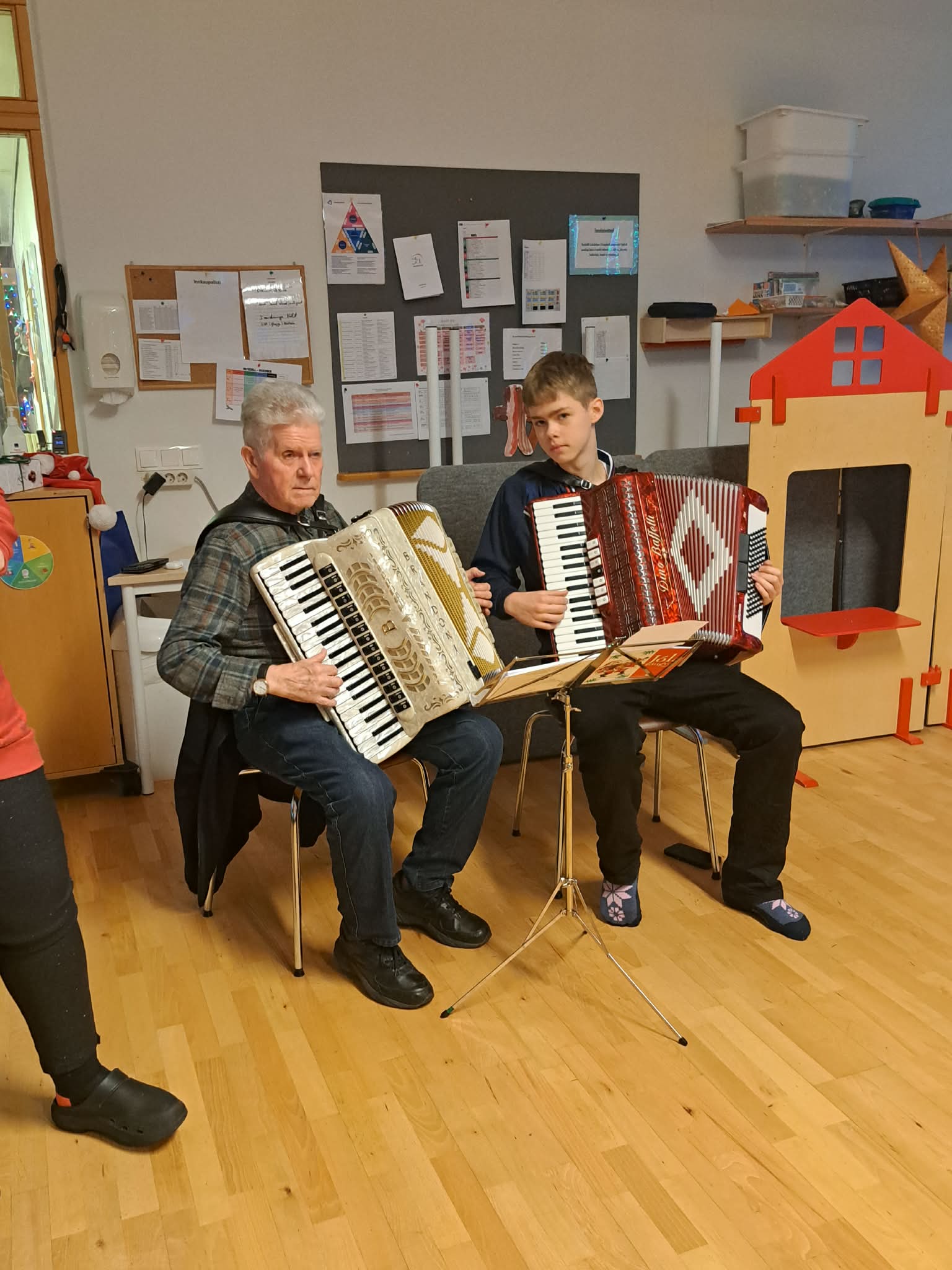 Að helgileiknum loknum var komið að því að dansa í kringum jólatréð. Það er sterk hefð fyrir því hjá okkur að hann Grétar í Áshól komi og spili á harmonikku á hátíðisdögum leikskólans en undanfarin ár hefur hann Víkingur Almar frá Riddaragarði, barnabarn Grétars, komið með honum og þeir spilað fyrir dansi. Það var enginn breyting á því í ár og þeir spiluðu af sinni alkunnu snilld.